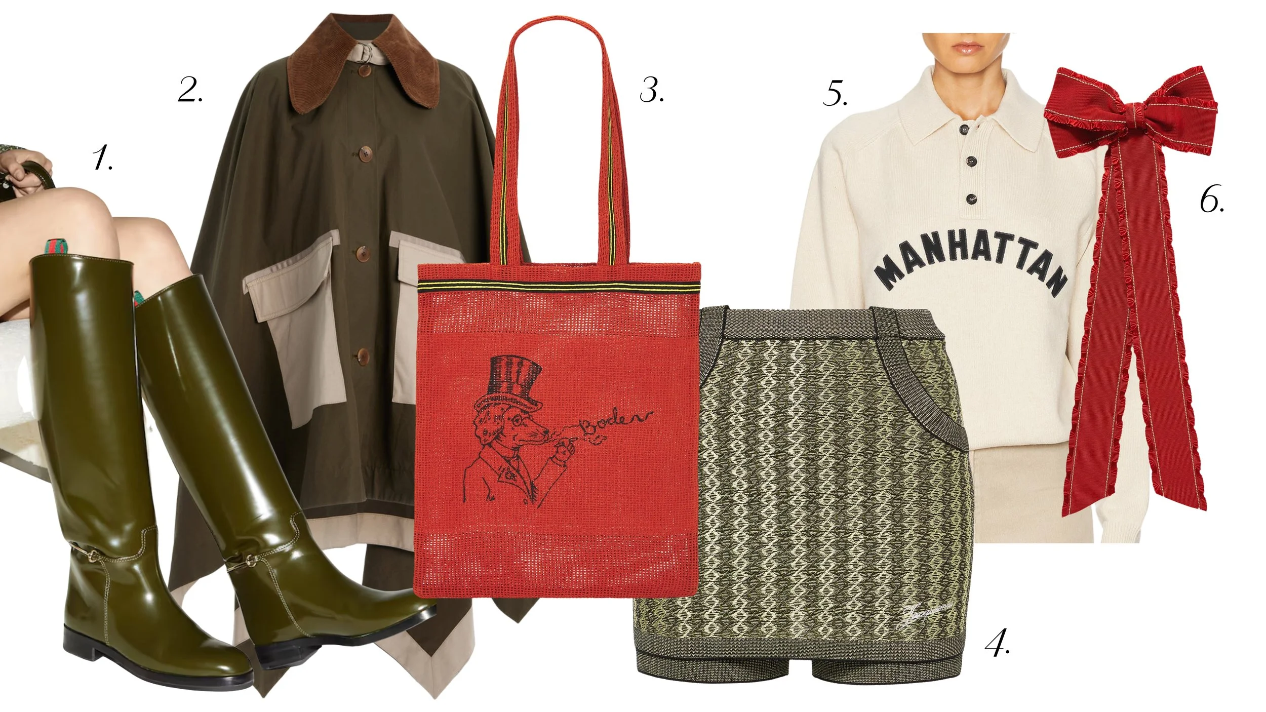 Barnyard Chores Never Looked So Good Slide 1 Slide 1 (current slide) Gucci Boots 2. Sea NY Poncho 3. Bode Tote 4. Jacquemus Skort 5. Bode Polo 6. Bode Bow